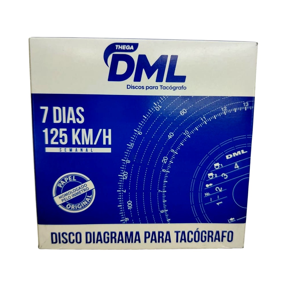 Caixa com discos de tacógrafo semanal para velocidade de até 125 km/h. Contém 10 conjuntos com 7 discos cada, totalizando 70 discos. Ideal para o registro contínuo da jornada de trabalho e velocidade dos veículos durante 7 dias consecutivos.