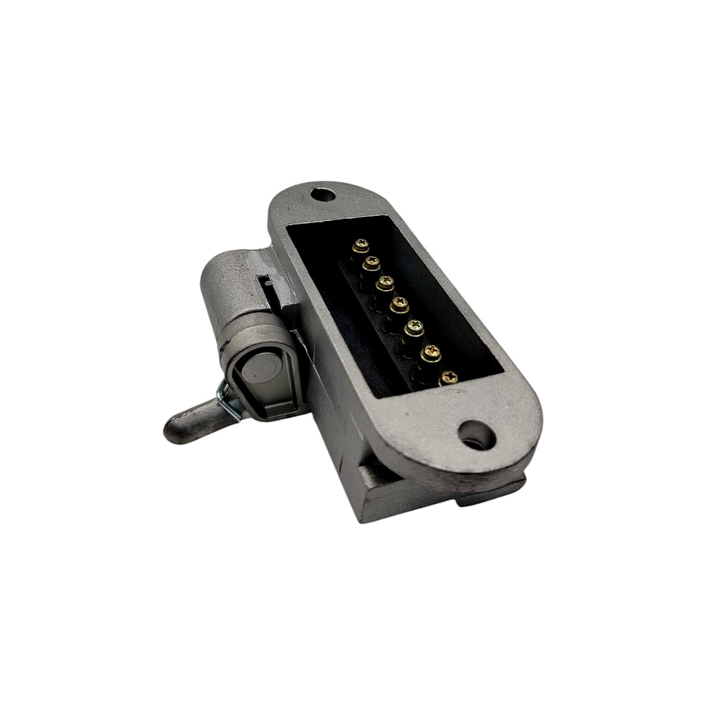 Tomada elétrica fêmea quadrada com 7 pinos, indicada para sistemas elétricos em carretas e implementos. Fabricada em alumínio, oferece alta resistência e durabilidade, ideal para uso em aplicações pesadas com exposição a intempéries.